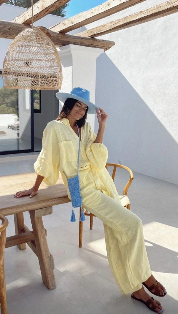 Butter Yellow легко сочетается с базовыми цветами: белым, бежевым, серым, джинсовым.