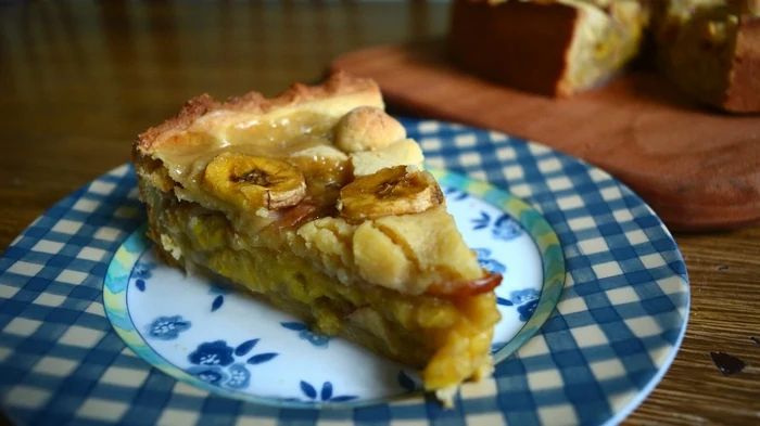 - Форму для выпечки смажьте сливочным маслом, дно выстелите пергаментом. Половину теста выложите в форму и разровняйте, затем разложите бананы и сверху залейте оставшимся тестом.