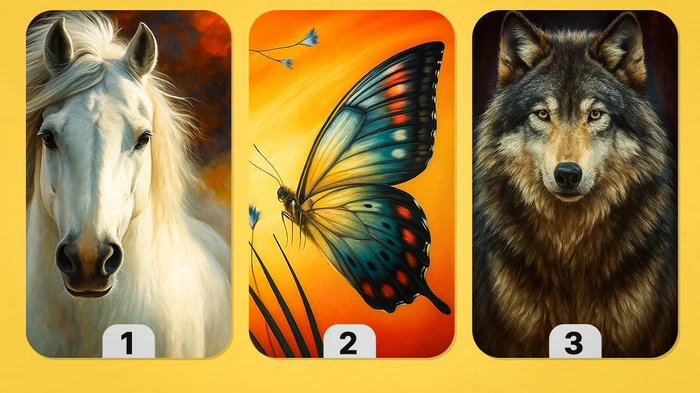 На картинке изображены лошадь, бабочка и волк. Посмотрите на три изображения, их цвета и визуальный стиль. Подумайте, какое из них лучше всего отображает ваше внутреннее состояние на данный момент. На основе выбора вам будет дан полезный жизненный совет.