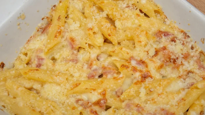 Приготовьте обед или ужин из простых и доступных продуктов, которыми можно накормить всю семью – макароны, пропитанные молочно-яичной заливкой, присыпанные сыром и запеченные в духовке.