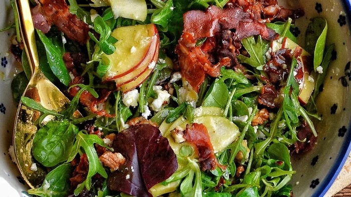 Именно таким является зеленый салат с хрустящим беконом, яблоками, сыром фета и орешками, рецептом которого поделилась блогер Monika Molecka. Этот салат настоящий взрыв текстур и вкусов, здесь все хрустит, сочетается, контрастирует и завораживает.